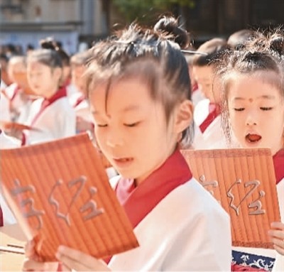 9月8日,江西省南昌市邮政路小学为一年级新生举行庄重的“开笔礼”仪式。同学们积极参与“朱砂启智”“击鼓鸣志”“启蒙描红”等活动,接受中华优秀传统文化的熏陶。图为孩子们齐声诵读“三字经”。