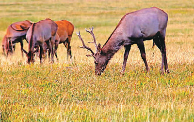 图二:2018年以来,新疆哈密市启动东天山生态保护与修复工作,通过划定生态红线、禁牧还草、围栏养殖等措施,让生态环境得到逐步恢复。图为成群马鹿徜徉在哈密丰美的草原上自由往来。 |