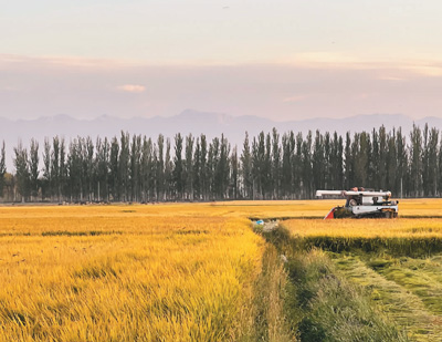 位于伊犁河南岸的新疆生产建设兵团第四师可克达拉市68团正在进行水稻收割。远处山峦起伏,眼前金色良田,丰收景象美不胜收。 本报记者 张一琪摄