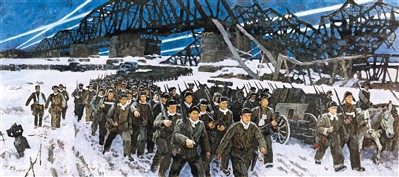 思路,定格在大部队“跨过鸭绿江”这一节点时,其时间、环境和人物形象也就鲜明起来。初冬寒冷的夜晚、遍布足迹的雪地、被敌军轰炸过的鸭绿江大桥、无声疾行的队伍、坚毅而从容不迫的神情……都成为作品中反映题材的基本符号。