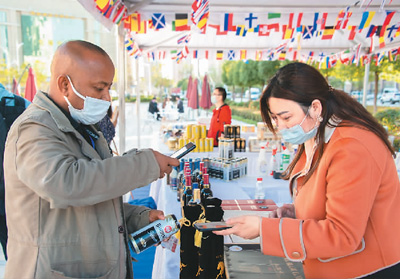 10月12日,与会嘉宾在扫码支付购买商品。 伍志尊摄(新华社发)