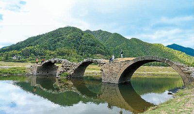 金秋时节,许多游客来到江西省上饶市婺源县段莘乡王村,与一座三眼石桥同框合影。这座石桥名为“永济桥”,已经有200多年的历史,桥左侧的石拱阳面有“挹秀”石匾,阴面有“荡云”石匾,中间的石拱阳面有“永济桥”行书匾。每年春水过后,此桥逐渐被水淹没,水库的水阻碍了交通,却保护了石桥;秋冬之季,石桥就会露出真容,历经风吹雨打,屹立至今。