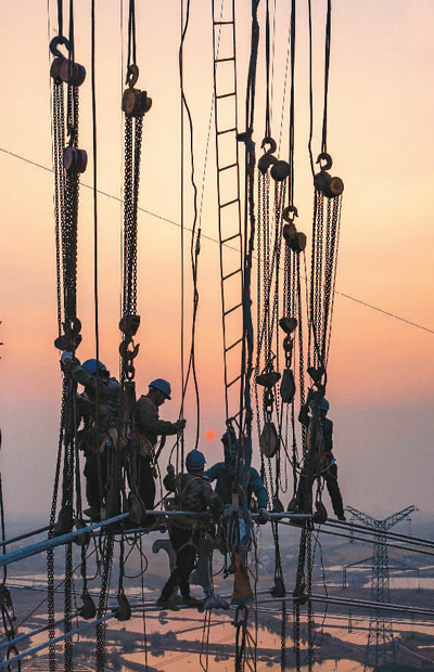 近日,在白鹤滩—江苏±800千伏特高压直流输电线路工程江苏段,江苏省送变电有限公司施工人员正在百米高空横跨S39江宜高速架设导线。