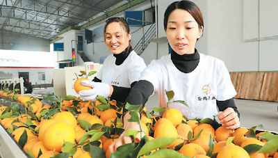村民在四川省眉山市仁寿县天贵社区电商服务站分拣柑橘。 |