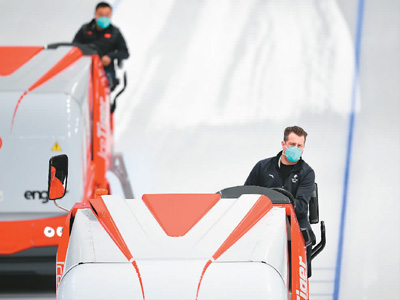 国家速滑馆的中外工作人员在比赛间隙修整赛道。 |
