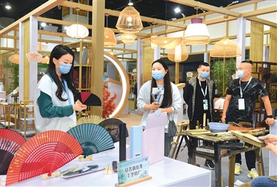 以“绿色低碳,共同富裕”为主题的第14届中国义乌国际森林产品博览会近日在浙江义乌国际博览中心举行。图为采购商在采购竹制工艺扇。 |