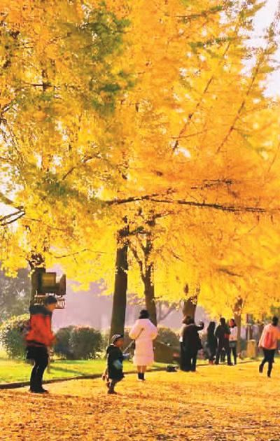 秋风真是一个神奇的魔法师,原本绿意葱茏的银杏树,短短几天,就被镀成了一片太阳光般耀眼的金黄;树下也铺满金黄色的叶子,远远望去,行人如同走在一条金色的道路上。