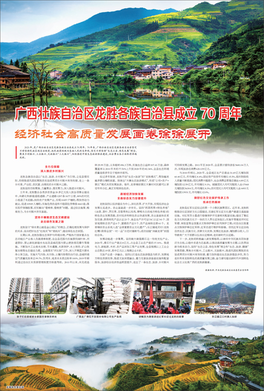 2021年,是广西壮族自治区龙胜各族自治县成立70周年。70年来,广西壮族自治区龙胜各族自治县坚定不移坚持民族区域自治制度,把民族团结视为各族人民的生命线,坚定不移坚持“生态立县、绿色发展”理念,聚焦乡村振兴、工业振兴、文旅振兴“三大振兴”,加快推进中国生态旅游强县建设,社会事业各方面取得卓越成就。