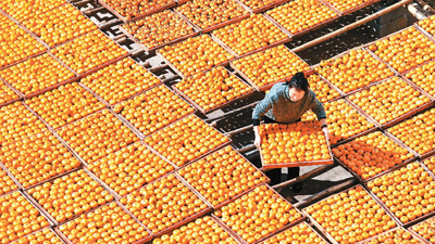 近日,广西壮族自治区桂林市恭城瑶族自治县的柿子迎来加工季,当地农民趁着晴好天气加紧对采收的柿子进行去皮、晾晒加工。据了解,恭城县月柿种植面积约22万亩,产量约63万吨,拥有一批深加工企业,月柿种植成了农民增收致富的重要产业。