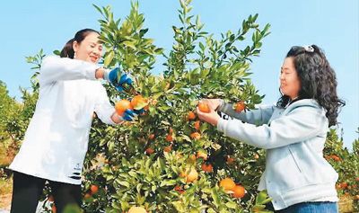 湖南省邵阳市新邵县石庙村的湘西南柑橘综合示范园种植40多个品种柑橘,为附近100多名群众提供就业岗位,还吸引许多游客前来游玩、采摘,促进了农民增收。图为游客在采摘柑橘。