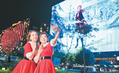 香港“闪烁尖东耀香江”近日正式亮灯,尖东一带多座大厦的外墙灯饰同时亮起,为香港增添美丽景色。图为游客在景观墙前合影。
