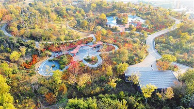 图三:江苏省徐州市五山公园原为山体、采石场废弃地。当地政府利用“海绵城市”理念实施山体生态修复再造,将“城市伤疤”打造成运动休闲公园。图为日前无人机拍摄的五山公园。 |