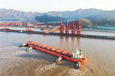 图一:11月15日,浙江省宁波舟山港穿山港区中宅矿石码头,装载着178256吨进口铁矿石的“日照枫叶”轮正在靠泊码头,即将进行接卸作业。 |