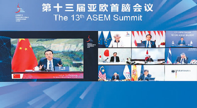 李克强表示,亚欧会议是亚欧之间规模最大的政府间论坛,53个成员人口占世界总人口近六成,经济总量占世界一半,贸易总量接近全球七成,在国际政治经济版图上有着重要影响。习近平主席提出,要在亚欧大陆架起一座友谊与合作之桥。当前亚欧国家共同面临应对疫情挑战和推动经济复苏的重要议题,既要有战胜困难的信心和勇气,也要坚持团结合作这一正确的途径和办法。要坚持自由贸易,保持全球产业链供应链稳定畅通。区域全面经济伙伴关系协定(RCEP)明年如期生效实施,将为地区经济复苏提供新的动力。