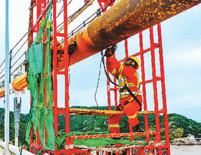 11月28日,养护工人在岱山官山大桥上为主缆作最后一个施工段的除污涂装。