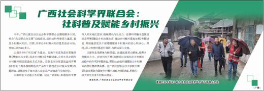 今年,广西壮族自治区社会科学界联合会围绕服务大局,结合“我为群众办实事”实践活动,组织社科专家深入基层,普及乡村振兴知识。目前,共举办乡村振兴知识普及活动10场,参加人数5000多人。