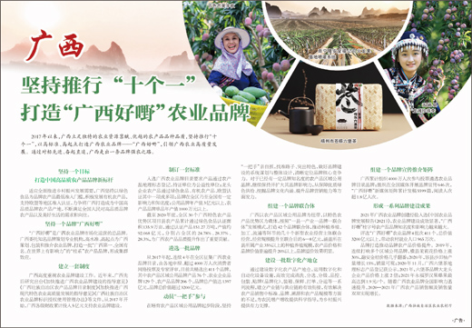 2021年广西农业品牌创建经验入选《中国农业品牌发展报告(2021)》,农业品牌建设成效显著,“广西好嘢”桂字号农产品品牌知名度和影响力越来越大。