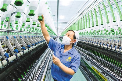 江西省瑞昌市华瑞(中国)缝纫线有限公司是该省全流程自动化、智能化的纺纱生产线企业。目前,公司新生产线已实现生产自动化、技术控制智能化,提高了生产效率和管理水平,助力企业高质量发展。图为日前工人在生产车间更换粗纱。 |