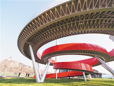 12月21日,北京冬奥公园标志性景观节点“冬奥之环”正式亮相。“冬奥之环”位于首钢滑雪大跳台西北侧,顶部的银色环形钢圈科技感十足,中间的红色阶梯如丝带环绕而下,绘就了艺术字体的“冬”字式样。“冬奥之环”和与之相连的高线公园将永定河和首钢园连接起来,实现生态园林与工业遗址的完美交融。