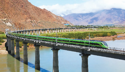 6月8日,试运行的复兴号列车行驶在西藏自治区山南市桑日县境内。 |