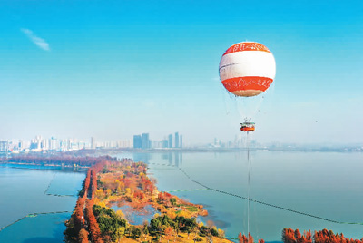 近日,首个观光氦气球亮相湖北武汉东湖。观光氦气球集观光、游览、休闲、科普等功能于一体,是华中地区首个空中旅游观光氦气球项目,为游客带来“水陆空”全方位城市文化旅游体验新模式。观光氦气球限30人乘坐,垂直升空最高为150米,升至最高处时,游客可360度全方位俯瞰东湖美丽景色及武汉城市风貌。上图为游客在武汉东湖乘坐观光氦气球游览。