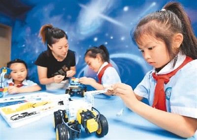 在刚刚过去的一年,全国各地大力落实“双减”政策,丰富学生课余生活,提升课后服务水平。图为2021年8月9日,贵州贵阳南明区花果园第二小学的学生,在老师的指导下利用课余时间组装智能机器人。 |