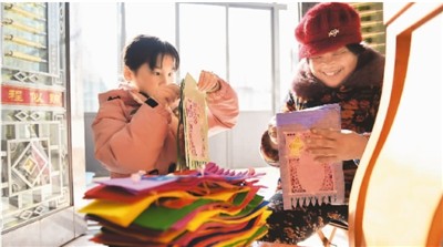 山东省临沂市郯城县的郯城挂门笺、木版年画都是省级非物质文化遗产,以其制作精良、色彩绚丽而深受消费者喜爱。图为1月2日,郯城县马头镇万高册村村民在制作挂门笺,供应节日市场。