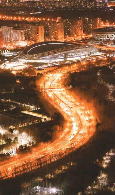 图为1月10日国家速滑馆“冰丝带”的夜景。 |