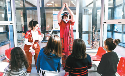 该中心工作人员扮成小丑与儿童互动。