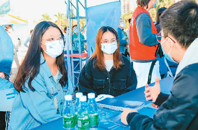 2021年“粤港澳大湾区大学生就业实习双选会”日前在暨南大学珠海校区开幕,吸引了大湾区内超2万家企业、100余家高校共同参与。图为参会企业代表在活动现场向学生介绍招聘信息。 |