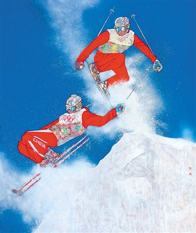 表现体育强国、全民运动的美术作品也有精彩呈现。雕塑家柳青的《瞬间的永恒》,“凝固”了残疾运动员准备跃入泳池的瞬间,以古典雕塑语言和纪念碑形式凸显静穆与伟大。王学贤、燕娅娅、王学儒合作的油画《体育强国,梦想激荡》则通过动与静的对比,冰与火的融合,用浪漫写意的风格和写实的绘画语言,展现了中国蓬勃发展的体育事业和百年激荡的中国奥运梦想。