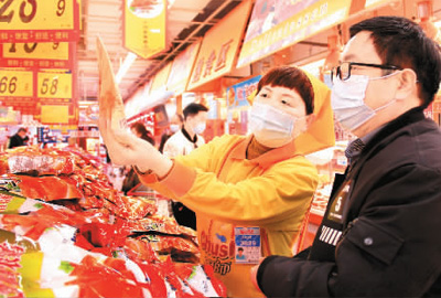 在北京华联生活超市太阳宫店,欢快的过年歌曲声声入耳,烘托得购物气氛年味十足。坐在推车里的孩子怀抱满满一袋砂糖橘,有模有样地帮着妈妈挑拣;年轻的情侣手牵手挑选蔬菜,讨论晚饭吃什么;“花生买一赠一”“红颜草莓低价大促”“新鲜的蔬菜来看一看”,超市工作人员热情地推销着……