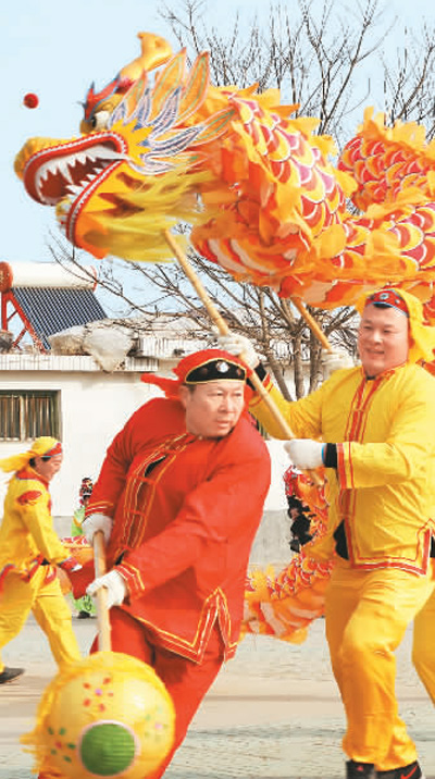 山东省临沂市沂南县青驼镇南长汪村群众排练舞龙,喜迎新春。 |