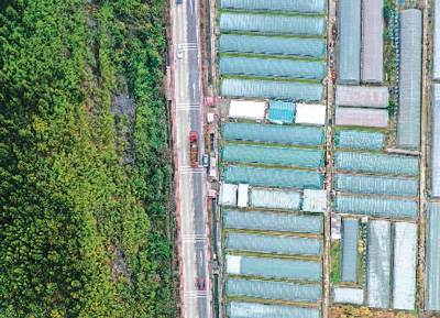 近年来,湖南省永州市道县依托城乡路网,大力发展现代果蔬设施产业,带动农产品外销、特色种养业和乡村旅游。图为1月26日,道县梅花镇,车辆行驶在果蔬大棚基地与青山之间的207国道上。 |