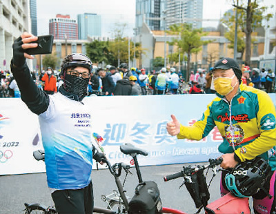 近日,澳门体育局举办“迎冬奥 新春单车行大运”活动,让市民以参与运动的方式为北京冬奥会喝彩。图为澳门市民在活动中合影留念。 |