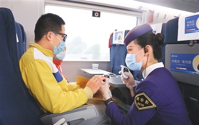 列车工作人员为乘车的盲人旅客讲解“一键呼叫”铃的使用方法。 |