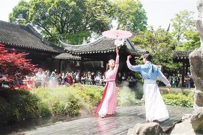 演员在苏州古典园林留园表演吴地古装歌舞。 |