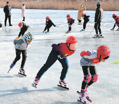 虽然北京冬奥会已经闭幕,但是各地居民对冰雪运动的热情丝毫不减。图为天津市武清区滨河道景区内孩子们在滑冰。