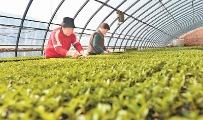 早春时节,甘肃省永靖县的苗农抢抓农时,开展果蔬幼苗培育工作,为农业生产和种苗市场提供保障。图为永靖县三塬镇一家育苗合作社农民在温棚内管护蔬菜秧苗。 |