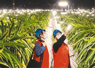 入春以来,广东惠州市供电部门根据春耕生产用电特点,主动当好农民的“电管家”,开展春耕备耕特巡特维和专项用电检查行动,确保春耕生产“电力十足”。图为2月21日,在惠州惠东火龙果种植基地,南方电网广东惠州供电局工作人员在进行用电检查和夜巡测温。