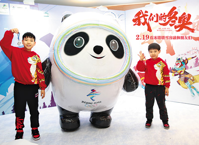 首映式上,小朋友们和“冰墩墩”合影。 |