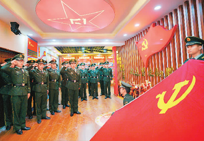 近日,武警警官学院学员一大队开展“听党话、跟党走、迎盛会”主题党日活动,进一步引领党员官兵坚定信念,牢记使命,担当作为,迎接党的二十大胜利召开。图为党员重温入党誓词。