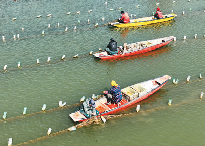 江苏省宝应湖农场引进珍珠淡水养殖,通过养殖珍珠吸收水中的浮游生物,既净化了水质,又助农增收致富。图为2月26日,农场工作人员在清除河蚌上的杂草,对嫁接的河蚌进行放养。