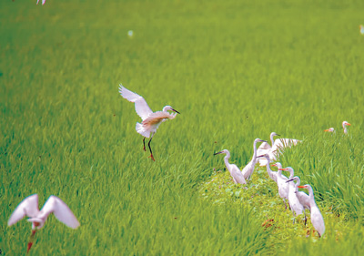 鹭“嬉”田野间 二月十九日,海南省琼海市龙江镇蓝山村,一群白鹭在绿油油的田野上飞翔嬉戏。 蒙钟德摄(人民视觉)