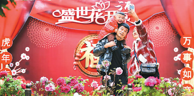 游客在甘肃省酒泉市肃州区观光生态植物园牡丹展厅留影打卡。 |