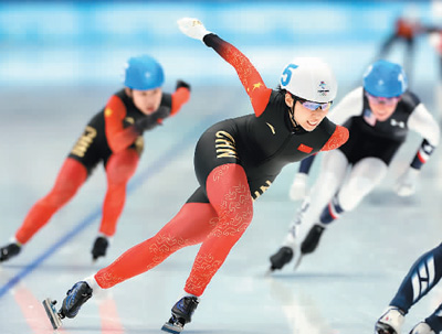 2月19日,北京冬奥会速度滑冰女子集体出发决赛,中国队选手李奇时身着中国企业赞助服装参赛。 |