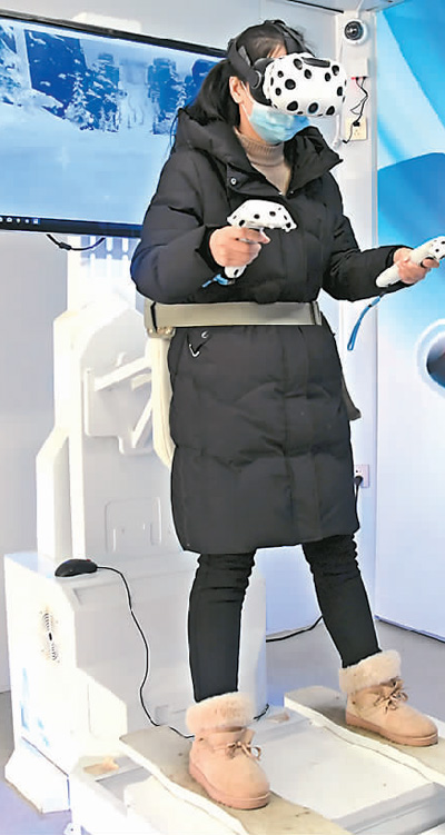 图为2月20日,市民在该文化广场体验VR滑雪。