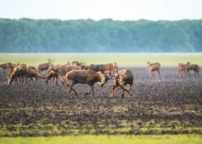 位于湖北省荆州市的石首麋鹿国家级自然保护区内,数百头麋鹿在长江天鹅洲故道水中嬉戏。 |