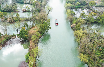 早春时节,浙江省杭州市西溪湿地新绿初绽,春光明媚,游船行驶在西溪湿地水道上。 |