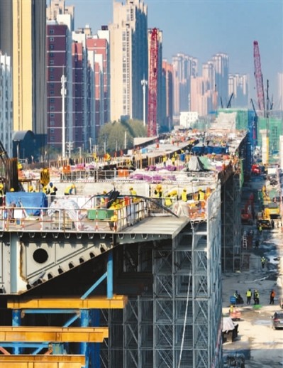 图为4月3日,工人们在包公大道高架项目工地施工。